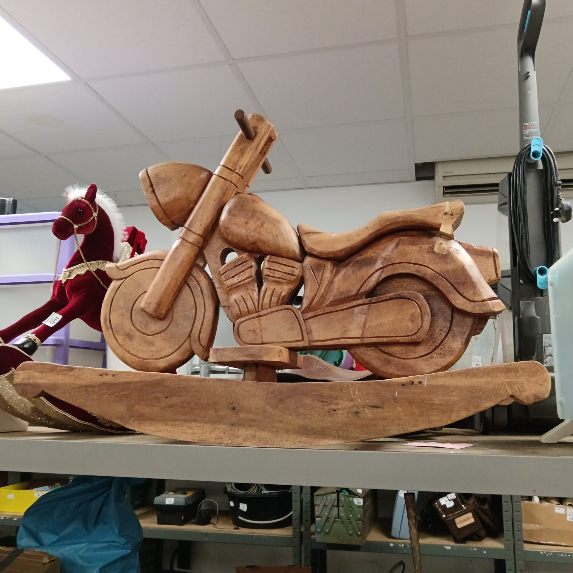 This is a hand-carved wooden rocking motorbike, a charming folk art piece depicting a classic motorcycle design. The sculpture features detailed carving throughout, capturing the form of a motorbike with wheels, handlebars, and a seat. It is designed to rock back and forth, making it a delightful decorative item or a unique toy.
