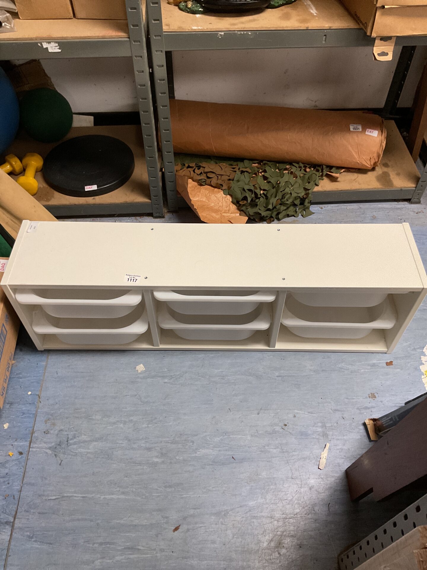 The storage unit shows signs of use, with some wear and tear visible. It may appeal to buyers seeking a functional storage solution or those interested in repurposing items. The unit’s simple design and white finish could make it a good base for a custom project or a practical addition to a playroom or craft room.
