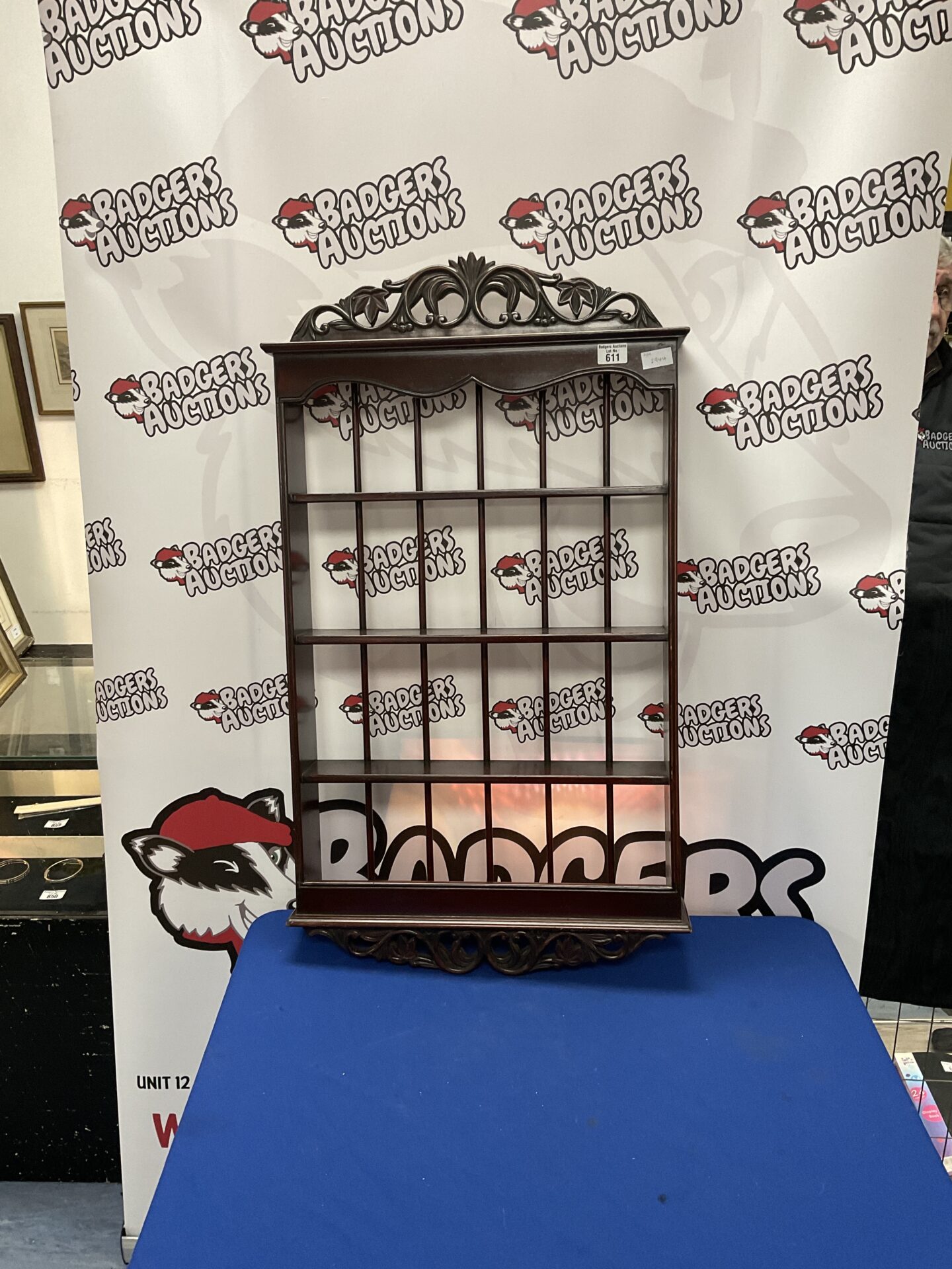 This is a wooden wall shelf, constructed with a warm-toned wood. The shelf features a tiered design with multiple levels for displaying collectibles, books, or decorative items. The design lends itself to a rustic or farmhouse aesthetic, and would be a charming addition to any room.