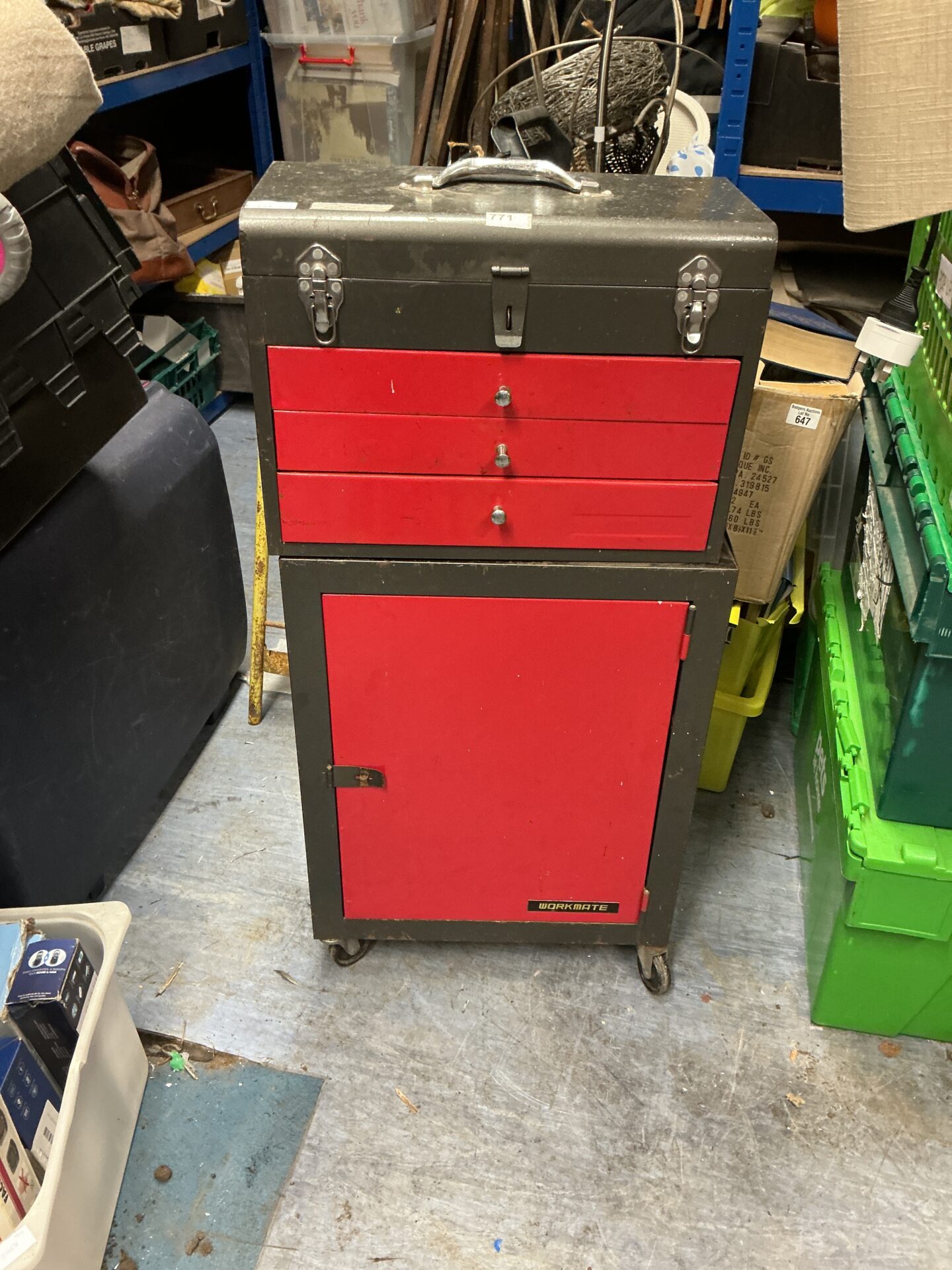 This is a Workmate tool chest, featuring a robust metal construction painted in a striking red finish. The chest has multiple drawers for organised storage, and a carrying handle for portability. It’s designed to complement a Workmate workbench, offering a convenient solution for keeping tools readily accessible during projects.