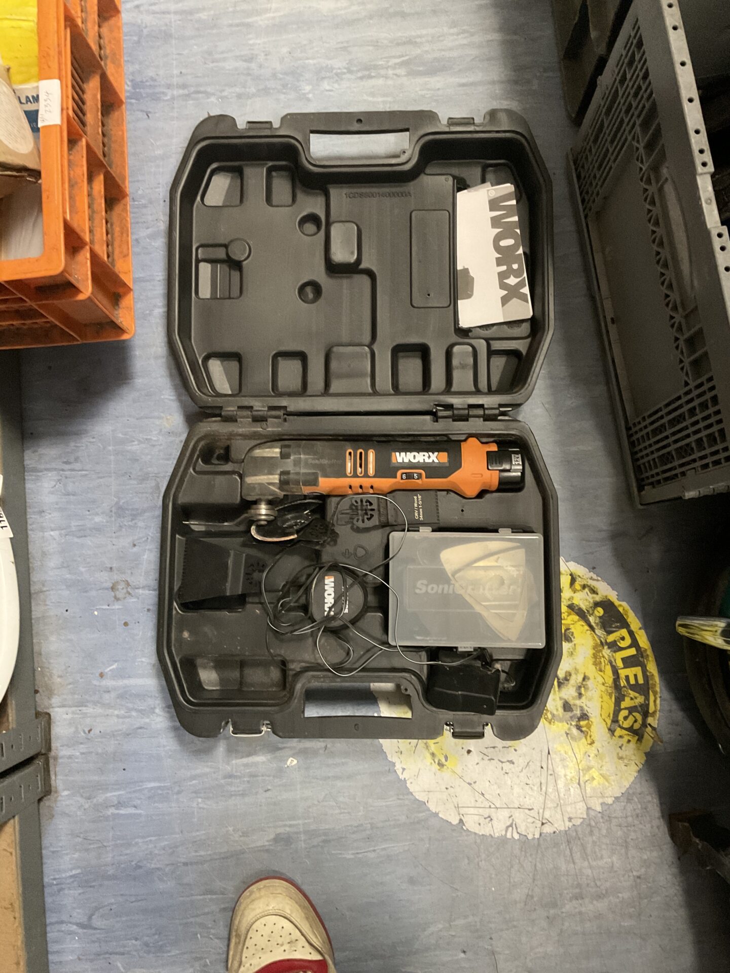 This Worx cordless omni tool set offers a versatile solution for DIY enthusiasts and home repair projects. The set includes a variety of attachments stored in a durable carrying case, providing convenience and portability. This used set shows signs of wear but may be functional and is ideal for those seeking a practical tool solution.