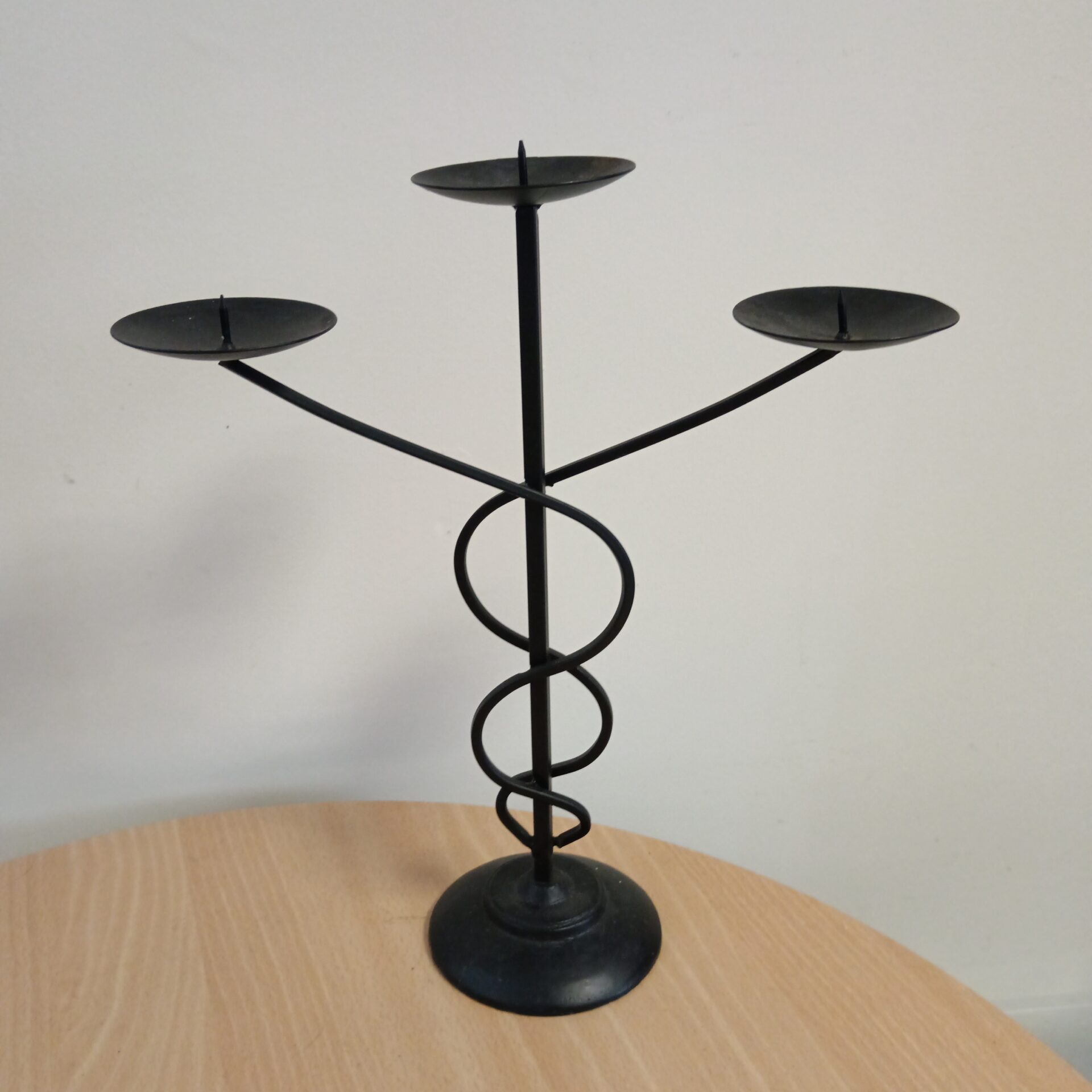 This striking candelabra is crafted from wrought iron, featuring a circular base that supports a slender, spiraling stem. Three arms extend from the central column, each terminating in a circular dish designed to hold a candle. The design evokes a gothic or Victorian aesthetic, lending itself well to dramatic or period-inspired settings. The ironwork displays a degree of craftsmanship, with the spiraling stem adding visual interest and a sense of movement.