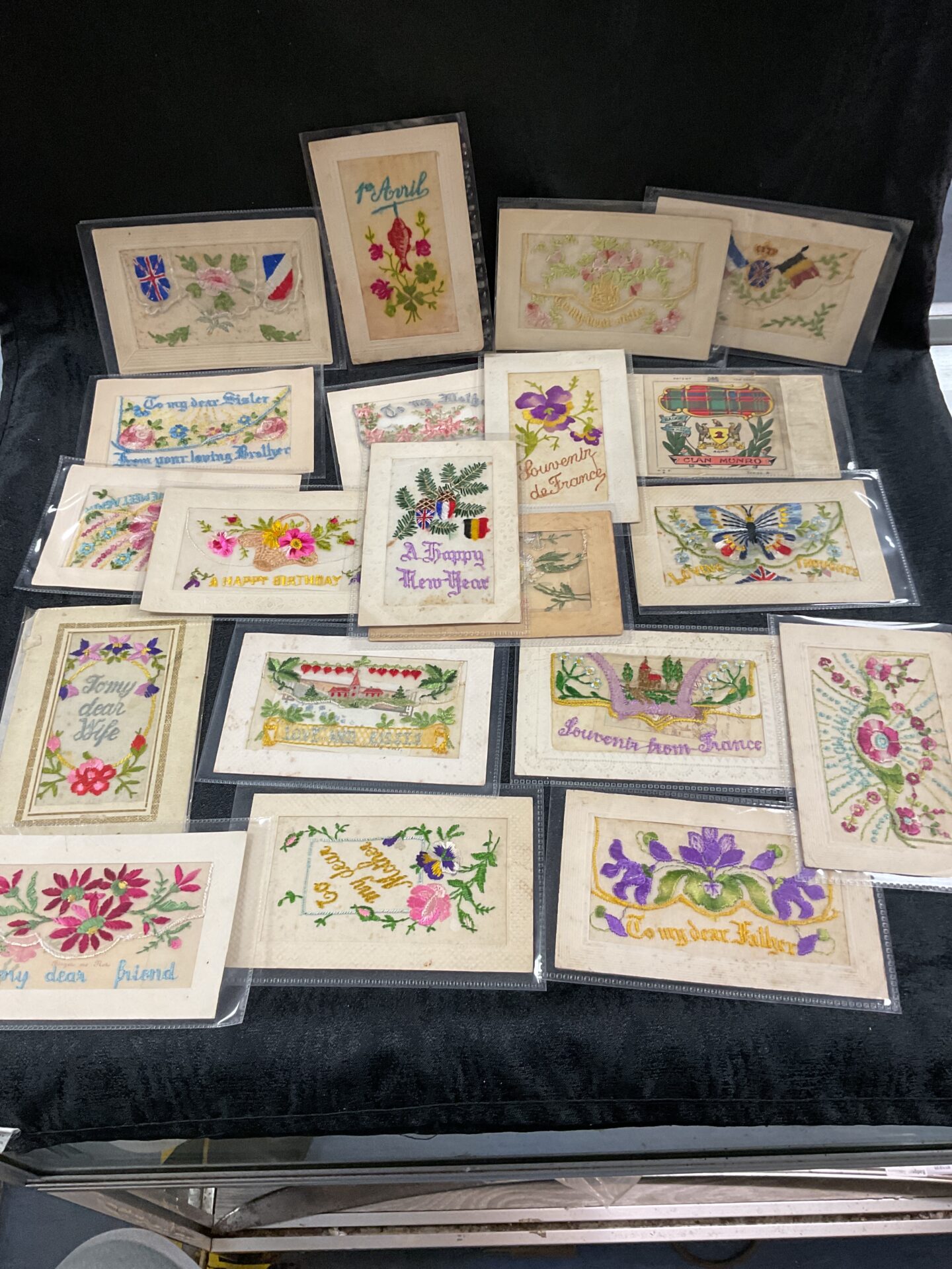 This lot comprises a collection of delicate silk postcards dating from the First World War. These postcards feature hand-embroidered patriotic designs, including flags, floral motifs, and emblems, reflecting the sentiments of the time. The silk base provides a unique canvas for these miniature works of art, often sent by soldiers or loved ones on the home front as tokens of remembrance and affection.