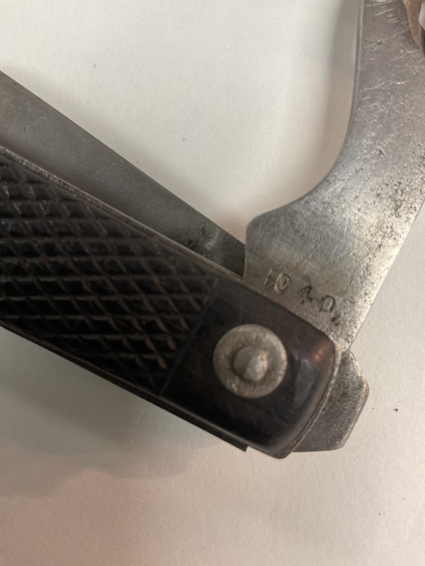 This knife shows signs of age and use, consistent with its wartime history. The blade and fork exhibit wear and patina, and the handle may have minor imperfections. Despite this, it remains a fascinating piece of military history, highly sought after by collectors of wartime memorabilia. Its original design and historical significance make it a desirable addition to any collection.