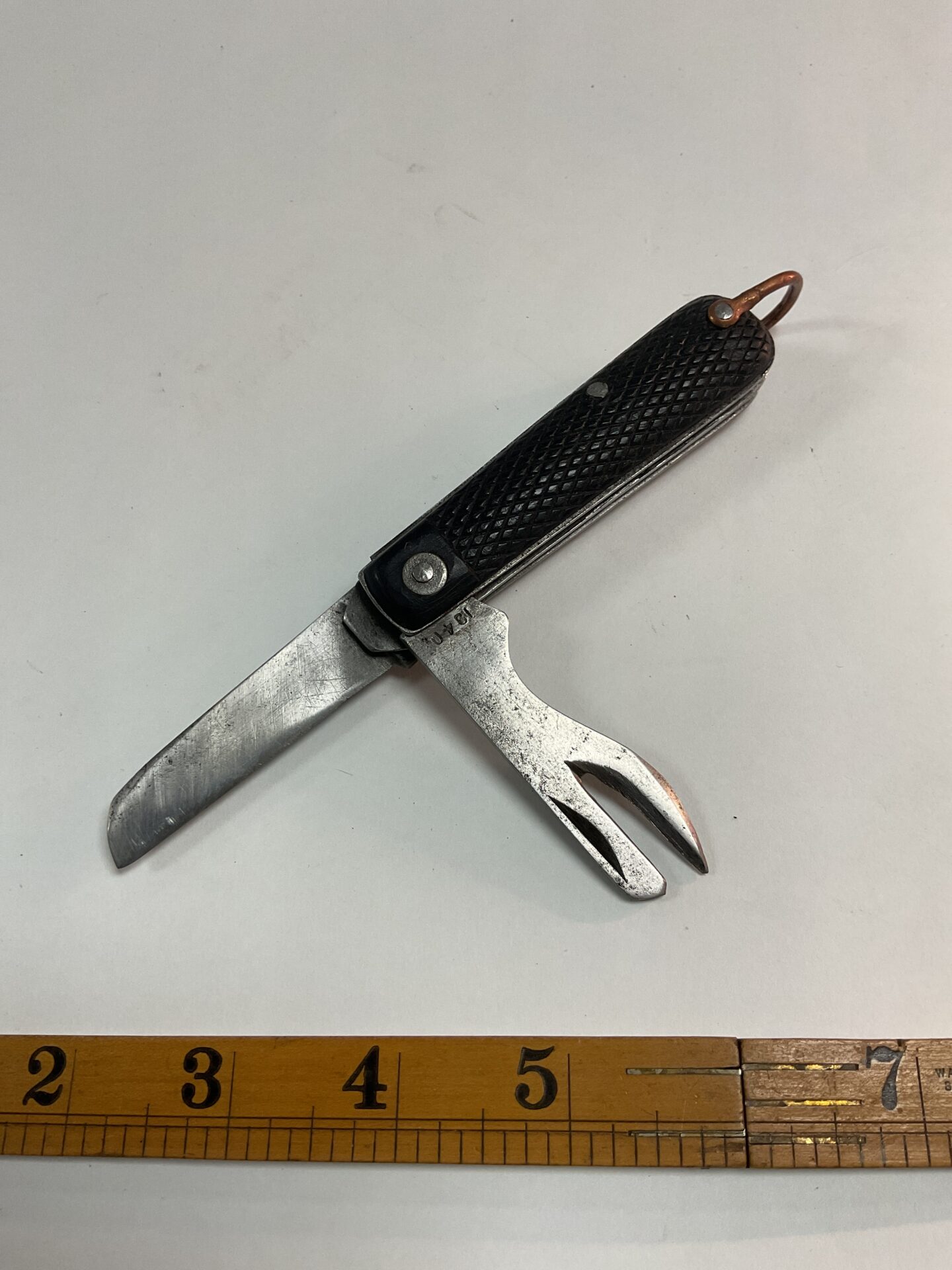 This is a classic British Army jack knife, dating back to 1940. These knives were standard issue to British soldiers during the Second World War, designed for utility and durability in the field. It features a folding design with both a blade and a fork, making it a versatile tool for various tasks. The handle is constructed from a textured material, providing a secure grip even in wet or challenging conditions.