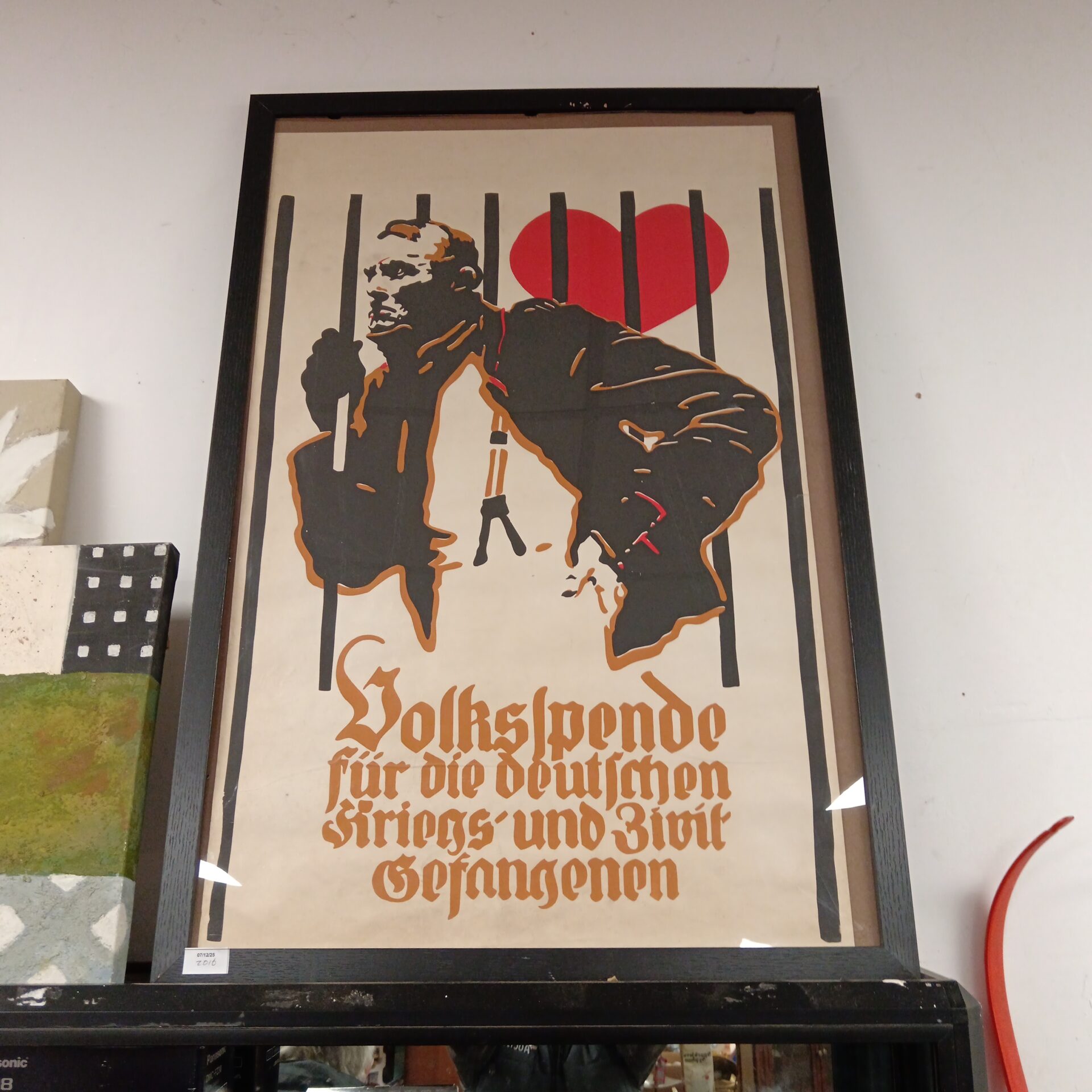 This striking poster dates from the World War I era, promoting charitable support for German prisoners of war. The design features a powerfully rendered figure, likely a soldier, reaching towards a heart symbol, conveying a message of compassion and aid. The bold graphic style is typical of wartime propaganda, intended to evoke strong emotional responses and encourage public donations to support those affected by the conflict.