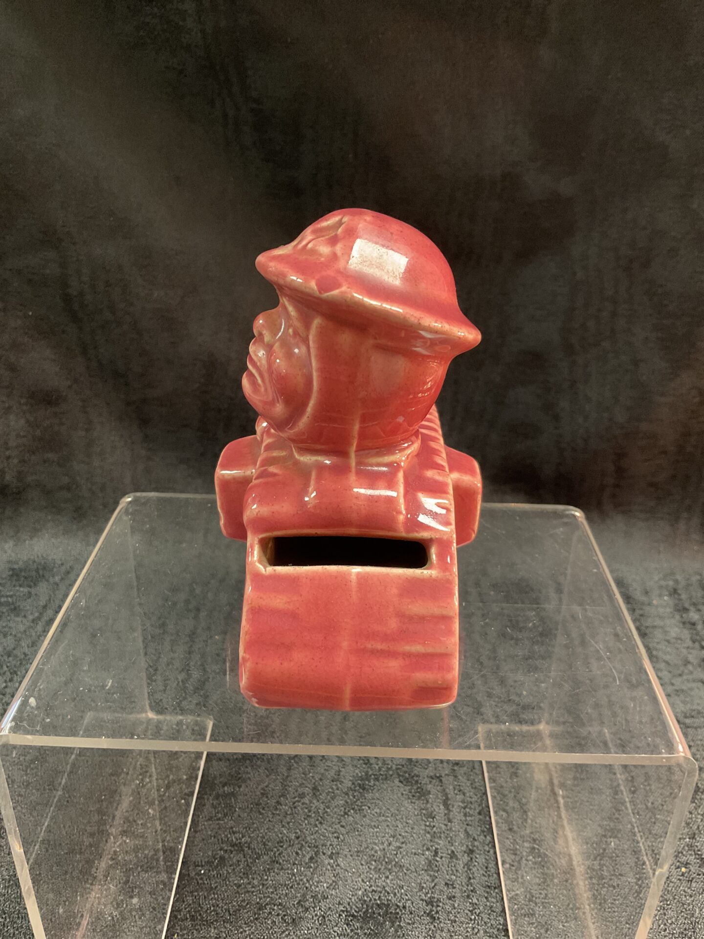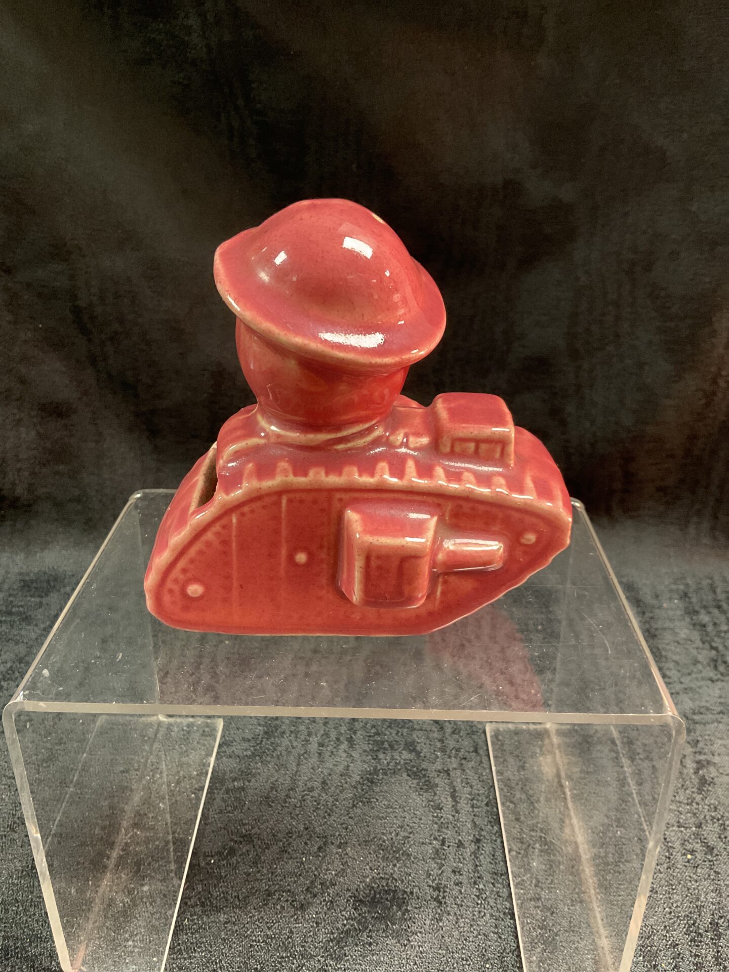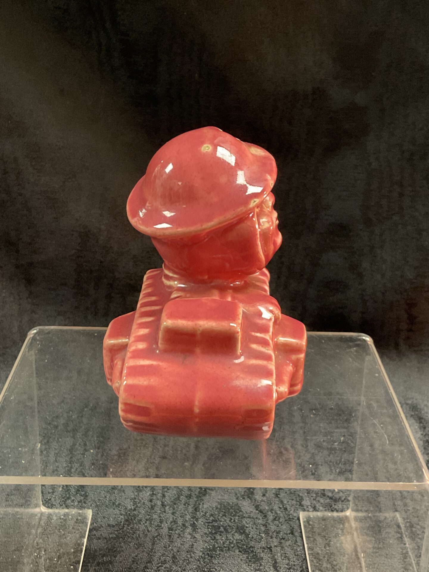 This is an antique ceramic figurine depicting “Old Bill”, a popular British WWI cartoon character created by Bruce Bairnsfather. The figurine is designed as a soldier emerging from a tank, embodying the spirit of the era. The phrase “Where’s That Blinkin Kaiser?” is inscribed on the base, referencing the common wartime sentiment. The vibrant red glaze and detailed sculpting capture the iconic imagery of the time.