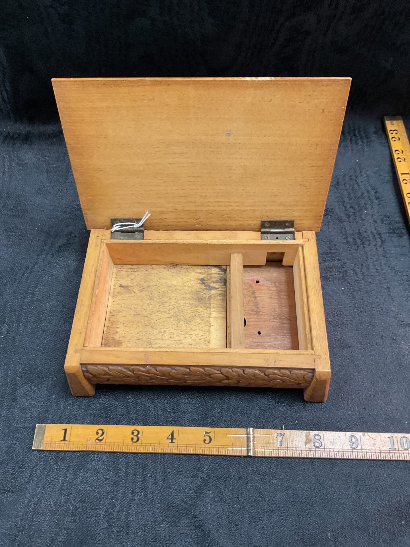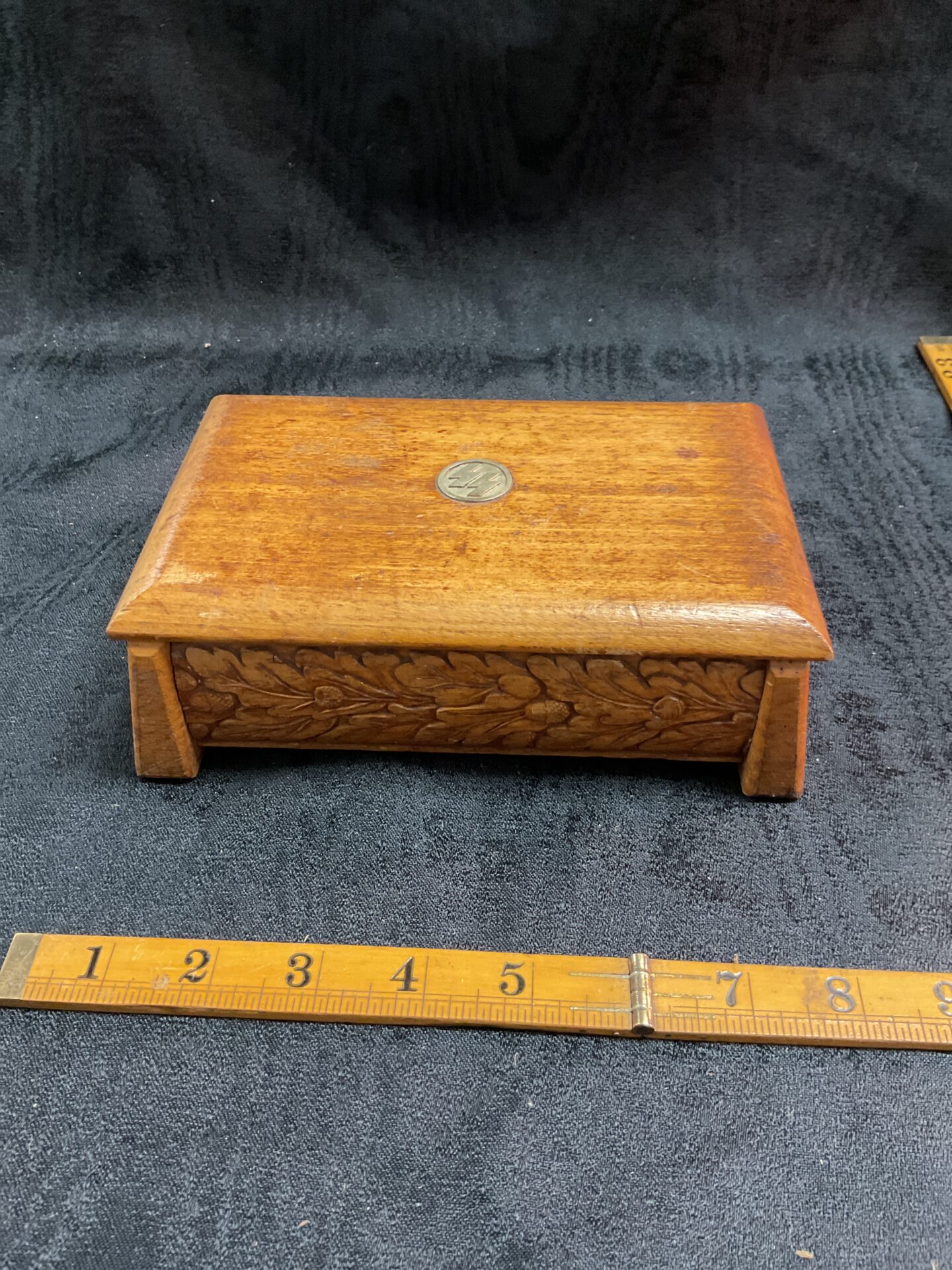 975 Ww2 German Ss Oak Music Box With Carved Oak Leaves And Brass Disc Inset In Lid (no Musical Movement)