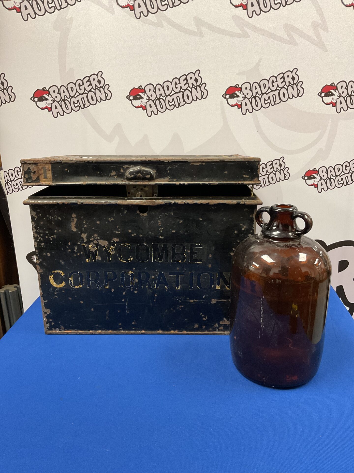 This antique lot features a Wycombe Corporation tin chest, likely used for storage or transport, displaying the crest of the Wycombe Corporation. Alongside the chest is a brown glass demijohn, a traditional vessel often used for storing liquids, such as wine or water. The chest exhibits a robust construction, indicative of its utilitarian purpose, while the demijohn adds a touch of historical charm to the collection.
