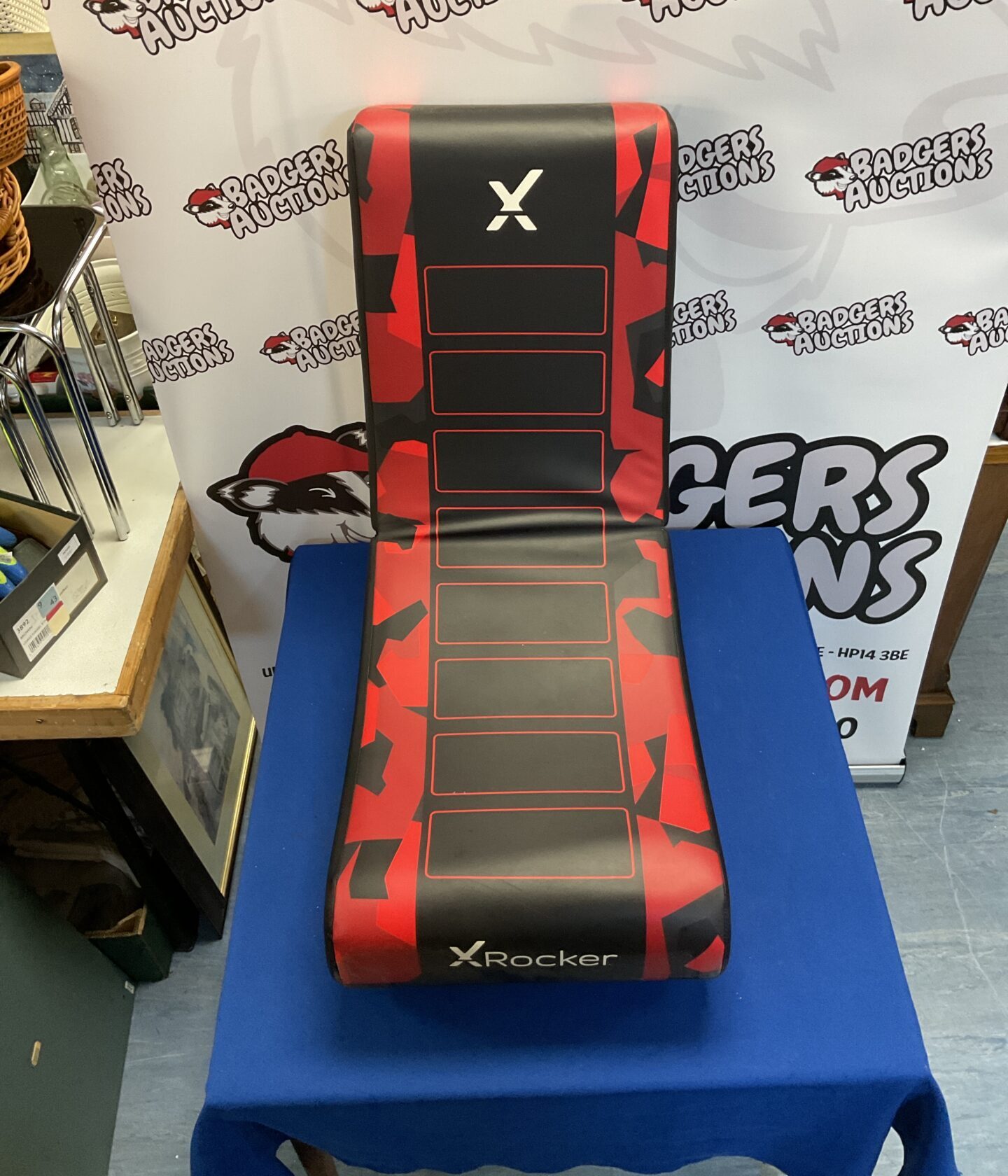 This X Rocker chair is presented for auction in a used condition. Please examine the images carefully to assess its cosmetic condition and any potential wear or damage. It may appeal to collectors of gaming memorabilia or those seeking a unique seating option for a gaming setup.