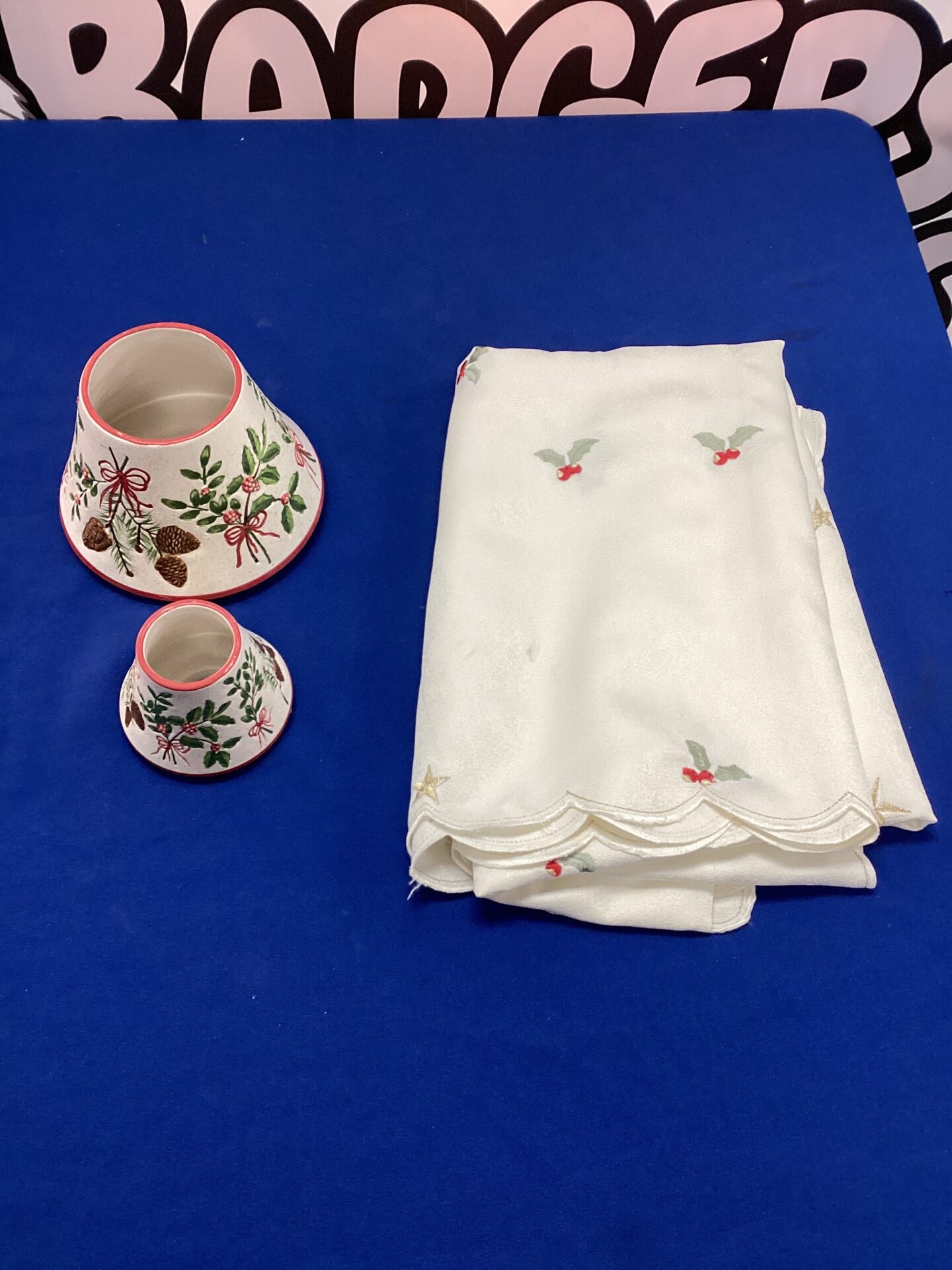 This lot features a large and small Yankee Candle shade, both decorated with a festive holiday Birch design. The shades are accompanied by a coordinating tablecloth, creating a cohesive seasonal display. The Birch motif adds a touch of winter woodland charm to any room, perfect for creating a cozy atmosphere during the holidays.