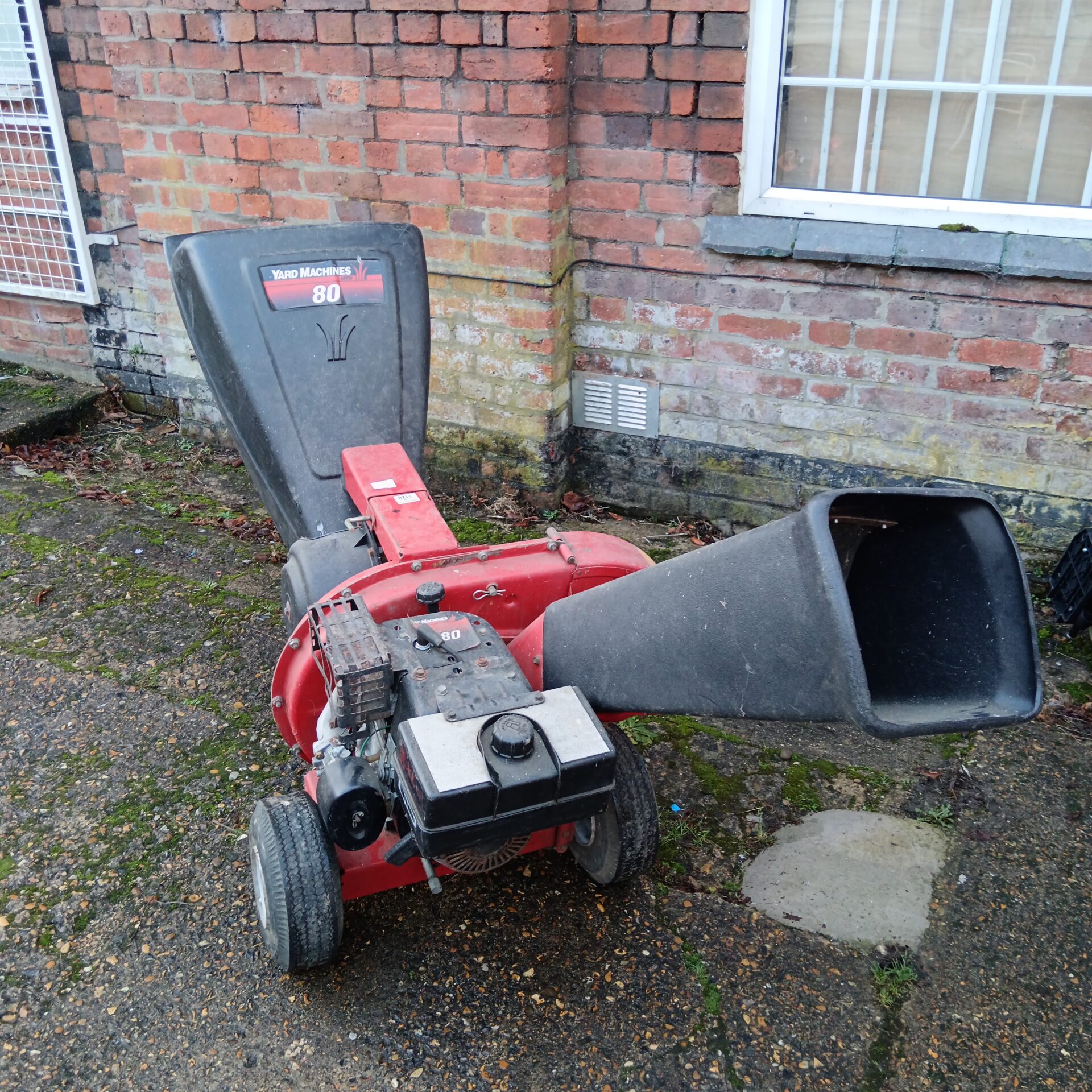 This Yard Machines 80 petrol chipper is presented for auction in used condition. The unit shows signs of wear consistent with outdoor use, and its operational status is unknown. It may be of interest to those undertaking restoration projects, or for use as a source of parts.