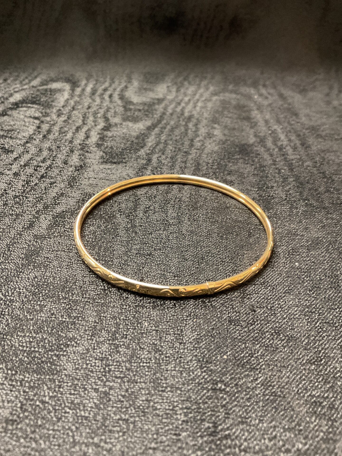This is a delicate yellow metal bracelet, featuring a slender band with etched detailing. The bracelet appears to be crafted from a gold-tone metal, offering a classic aesthetic. The etched design adds a subtle texture and visual interest to the piece, making it suitable for everyday wear or as a complement to more formal attire. It weighs 4.2g.