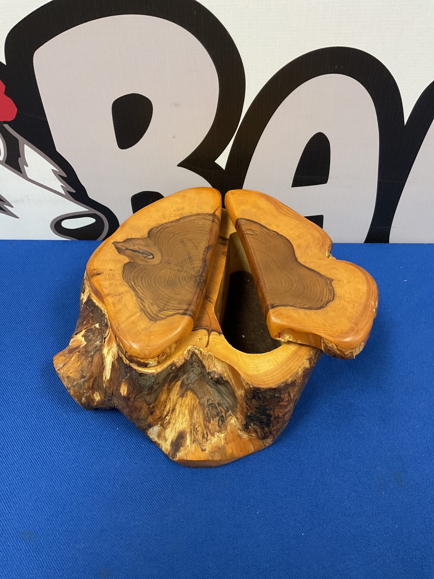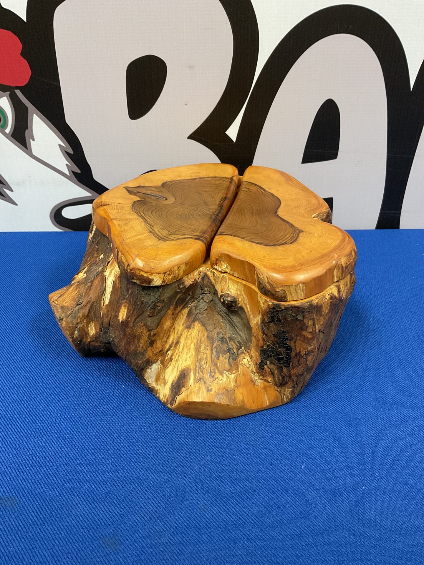 This charming trinket box is skillfully hand-carved from yew wood, resembling a section of a tree trunk. The box features two separate compartments, ideal for storing small jewellery, keepsakes, or other treasured items. The natural grain and warm tones of the yew wood are beautifully showcased, giving the piece a rustic and organic aesthetic.