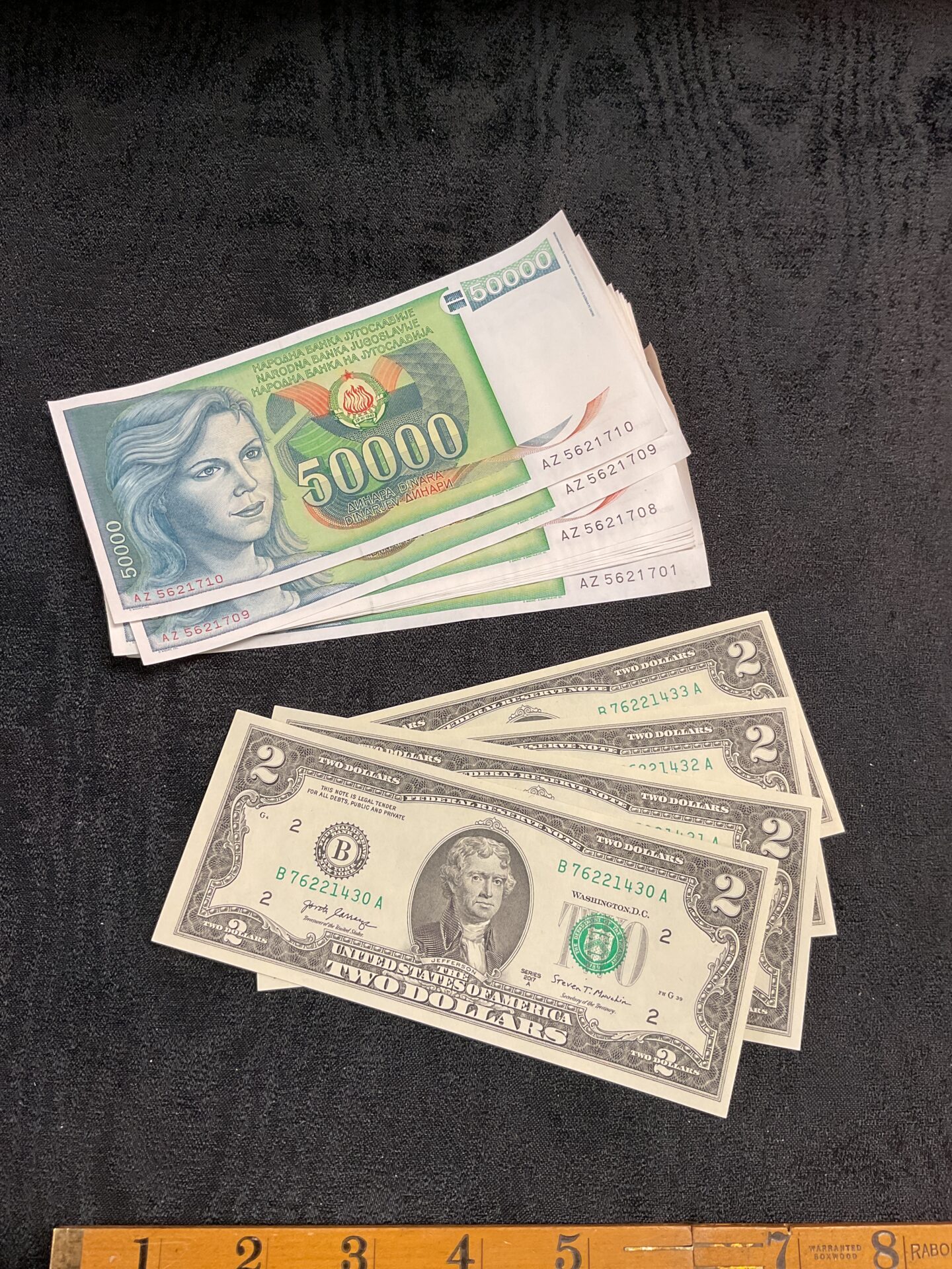 This lot comprises a selection of ten sequential Yugoslavian banknotes and ten US two-dollar bills. The Yugoslavian notes showcase designs representative of the former nation, while the US bills are a classic denomination often sought after by collectors. This combination offers a diverse range of paper currency for enthusiasts and collectors alike.