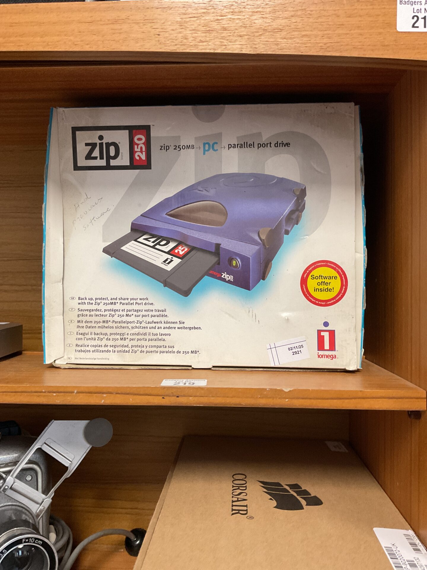 This is an Iomega Zip 250 parallel port drive, a removable storage solution popular in the late 1990s and early 2000s. The Zip drive offered a convenient way to transfer and back up data, bridging the gap between floppy disks and early USB drives. This particular model connects via a parallel port, a common interface on older computers, and boasts a 250MB storage capacity.