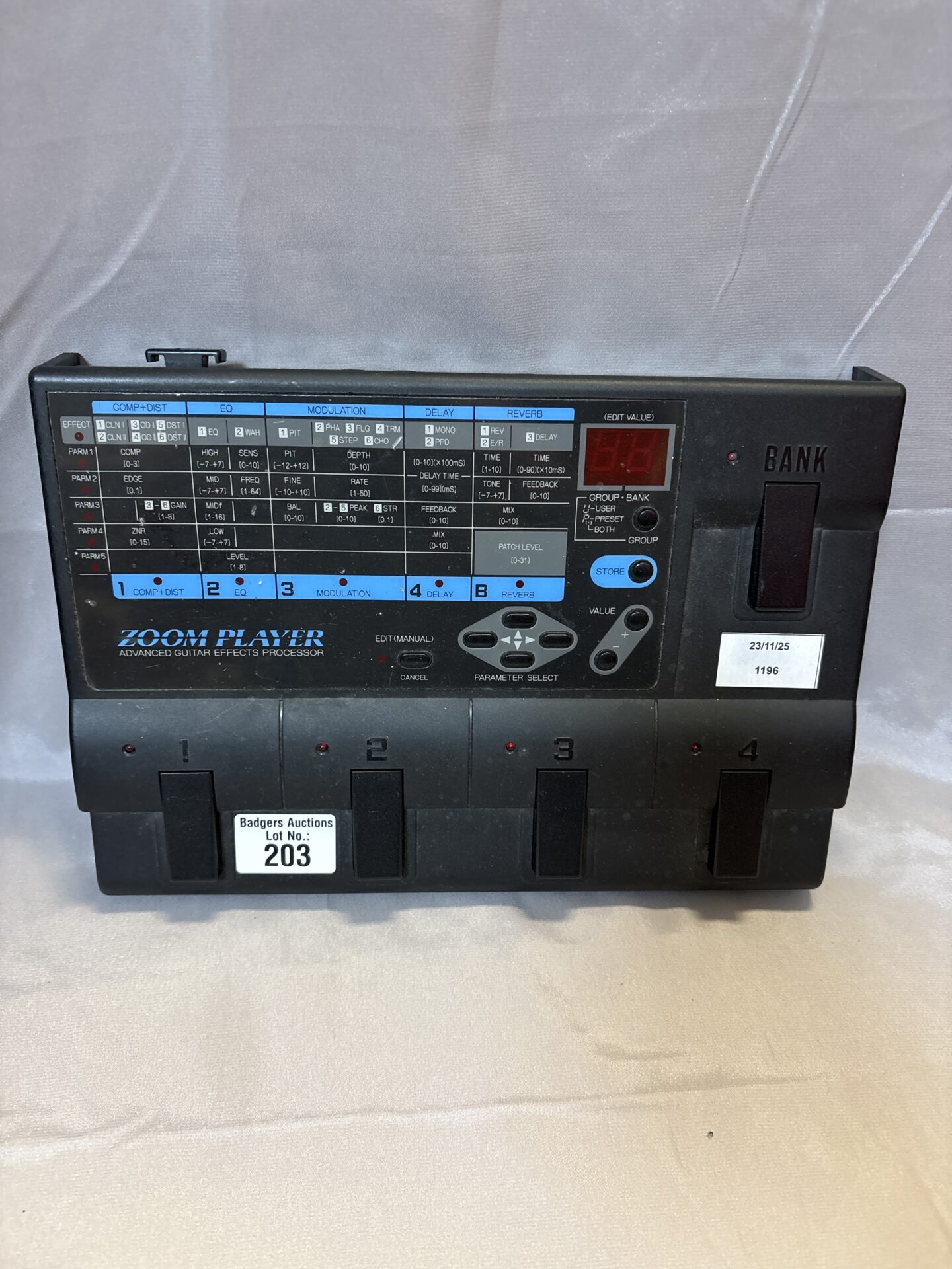 The unit presents as seen in the photographs, with signs consistent with age and previous use. It is offered in its original form, and its functionality is not represented. This Zoom Player 2020 would be of interest to collectors of vintage guitar effects, enthusiasts of 1990s digital processing, or those seeking a unique piece of musical equipment for display or potential restoration.