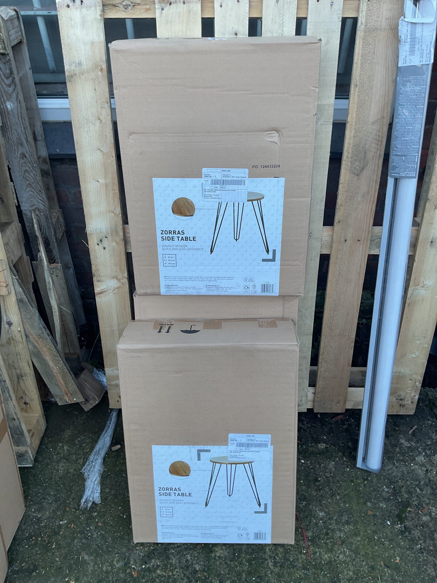This lot comprises three Zorras side tables, model PO124329. These tables feature a minimalist design, likely constructed from engineered wood with a light finish. Their compact size makes them versatile for use as bedside tables, living room accent pieces, or in smaller spaces where functionality and style are paramount.